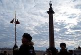 Виды Санкт-Петербурга во время подготовки к празднованию 80-й годовщины Победы в Великой Отечественной войне. Жанровая фотография. Жители города наблюдают за репетицией сводного военного оркестра Санкт-Петербургского гарнизона на Дворцовой площади.