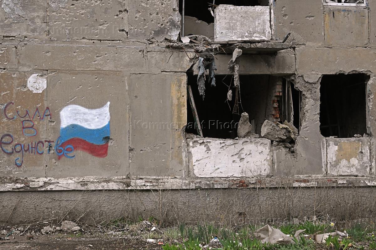 Ситуация в Донецкой Народной Республике (ДНР). Пострадавший от обстрела многоэтажный жилой дом. Надпись на стене дома "Авдеевка - Россия!".