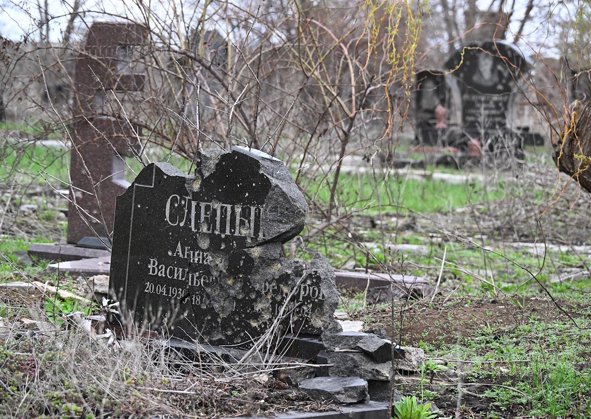 Ситуация в Донецкой Народной Республике (ДНР). Пострадавшие от обстрелов надмогильные памятники на окраине Донецка.