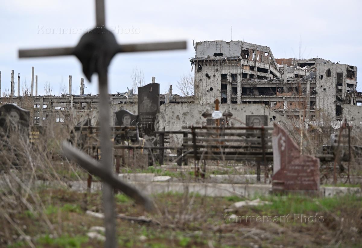 Ситуация в Донецкой Народной Республике (ДНР). Пострадавшие от обстрелов надмогильные памятники на фоне здания аэропорта Донецка.