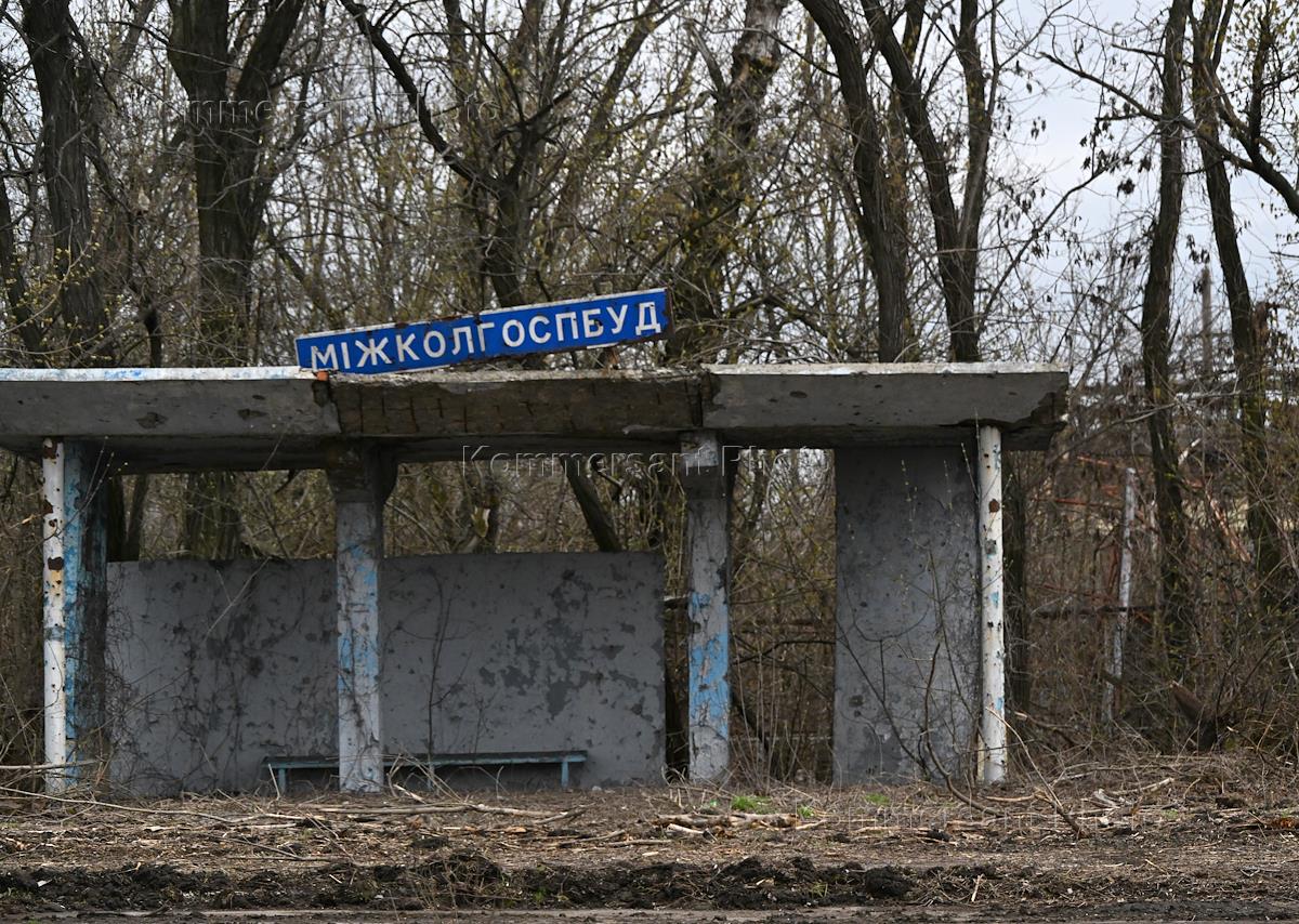 Ситуация в Донецкой Народной Республике (ДНР). Следы от снарядов на дорожном указателе.
