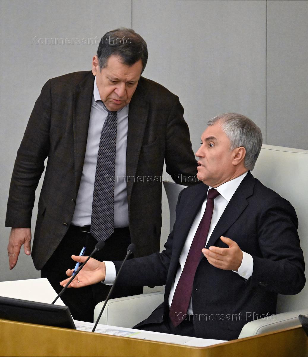 Пленарное заседание Государственной думы (ГД) России. Председатель комитета ГД России по бюджету и налогам Андрей Макаров (слева) и председатель ГД России Вячеслав Володин (справа) во время заседания.
