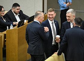 Пленарное заседание Государственной думы (ГД) России. Слева направо: заместитель председателя комитета ГД России по государственному строительству и законодательству Сардана Авксентьева, руководитель фракции партии "Новые люди" в ГД России Алексей Нечаев, председатель комитета ГД России по малому и среднему предпринимательству Александр Демин и председатель комитета ГД Россиb по туризму и развитию туристической инфраструктуры Сангаджи Тарбаев во время заседания.