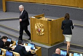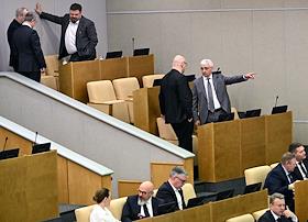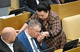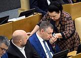 Пленарное заседание Государственной думы (ГД) России. Председатель комитета ГД России по безопасности и противодействию коррупции Василий Пискарев (слева) и первый заместитель председателя комитета ГД России по государственному строительству и законодательству Ирина Панькина (справа) во время заседания.
