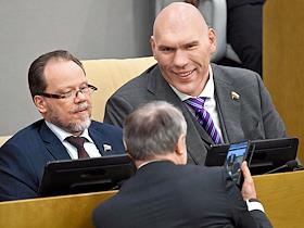 Пленарное заседание Государственной думы (ГД) России. Первый заместитель председателя комитета ГД России по культуре Александр Шолохов (слева) и первый заместитель председателя комитета ГД России по туризму и развитию туристической инфраструктуры Николай Валуев (справа) во время заседания.