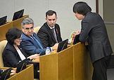 Пленарное заседание Государственной думы (ГД) России. Заместитель председателя комитета ГД России по экологии, природным ресурсам и охране окружающей среды Александр Коган (в центре), заместитель председателя комитета ГД России по энергетике Владимир Плякин (третья справа) и председатель комитета ГД России по делам национальностей Владимир Иванов (второй справа) во время заседания.