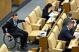 Пленарное заседание Государственной думы (ГД) России. Заместитель председателя комитета ГД России по труду, социальной политике и делам ветеранов Михаил Терентьев (слева) во время заседания.