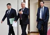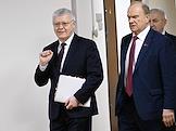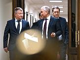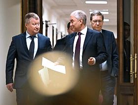 Пленарное заседание Государственной думы (ГД) России. Слева направо: руководитель аппарата ГД России Игорь Дивейкин, председатель ГД России Вячеслав Володин и первый заместитель председателя ГД России Александр Жуков перед началом заседания.