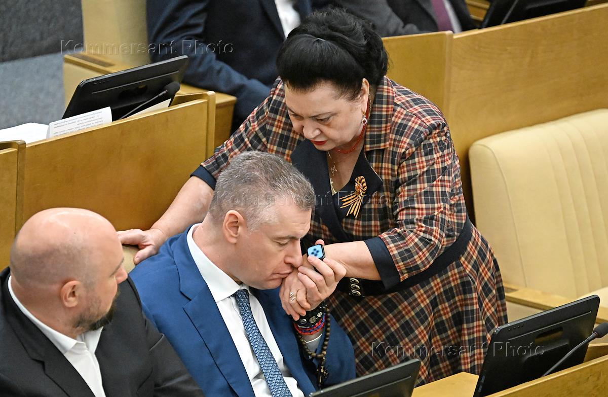 Пленарное заседание Государственной думы (ГД) России. Заместитель председателя комиссии ГД России по Регламенту и обеспечению деятельности Государственной Думы Раиса Кармазина (справа) и председатель Либерально-демократической партии России (ЛДПР), руководитель фракции ЛДПР в ГД России Леонид Слуцкий (в центре) во время заседания.