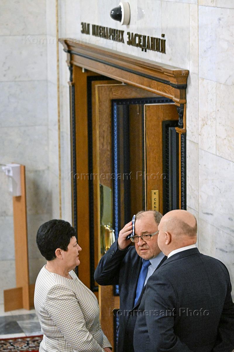 Пленарное заседание Государственной думы (ГД) России. Слева направо: член комитета ГД по культуре Ольга Германова, член комитета ГД России по бюджету и налогам Виктор Селиверстов и первый заместитель председателя комитета ГД России по обороне Андрей Красов перед началом заседания.