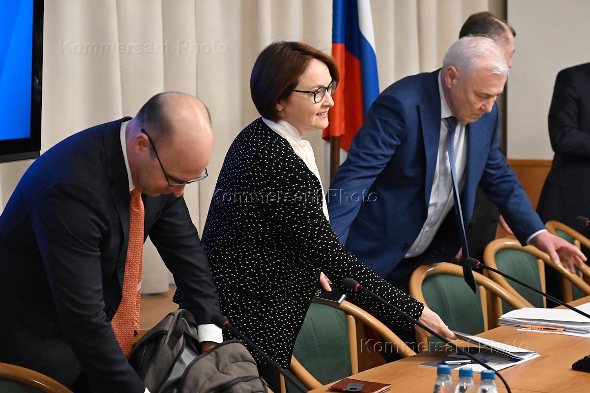 Совместное заседание комитетов Государственной думы (ГД) России по финансовому рынку, бюджету и налогам, экономической политике и контролю по рассмотрению годового отчета Банка России за 2024 год. Председатель Центрального Банка России Эльвира Набиуллина (в центре) и председатель комитета ГД России по финансовому рынку Анатолий Аксаков (второй справа) перед началом заседания.