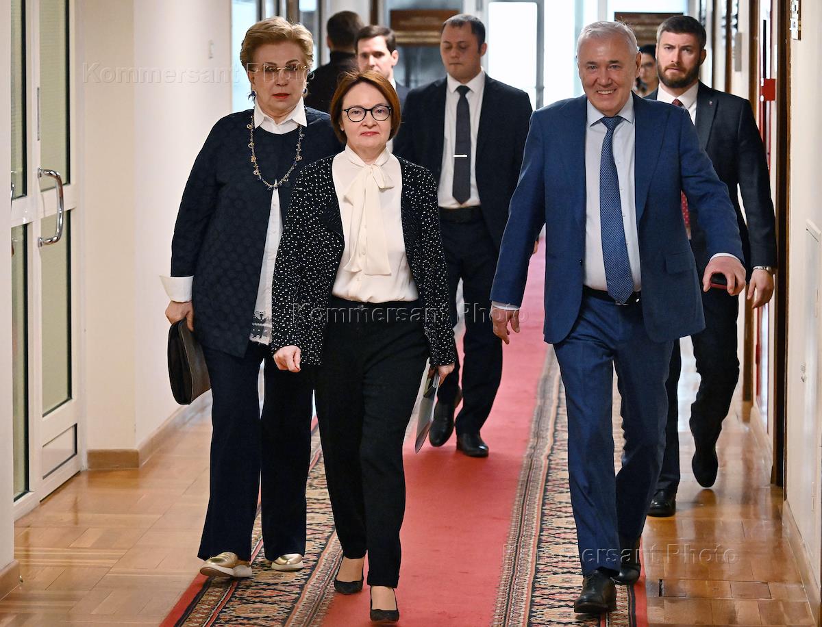 Совместное заседание комитетов Государственной думы (ГД) России по финансовому рынку, бюджету и налогам, экономической политике и контролю по рассмотрению годового отчета Банка России за 2024 год. Слева направо: заместитель председателя Банка России Алексей Заботкин, председатель Центрального Банка России Эльвира Набиуллина, и председатель комитета ГД России по финансовому рынку Анатолий Аксаков во время заседания.