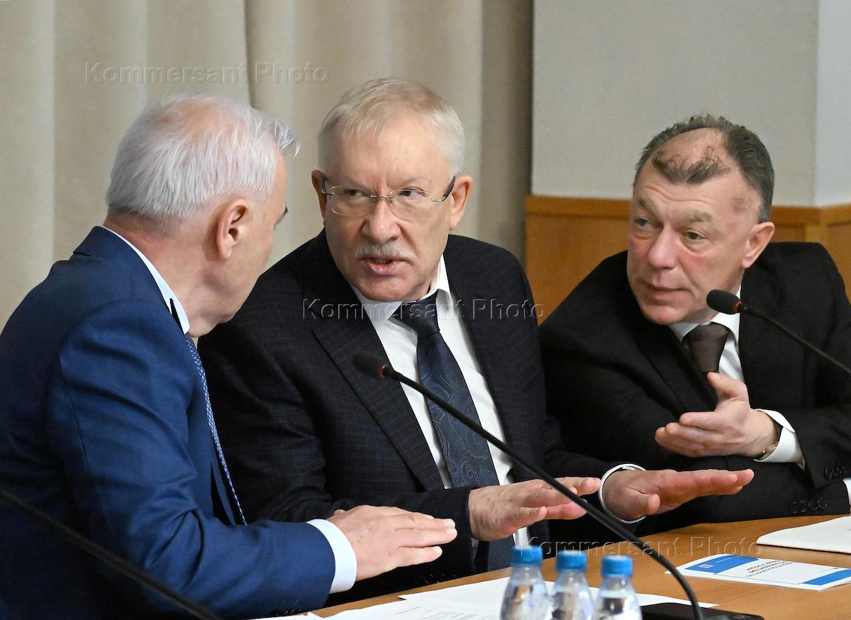 Совместное заседание комитетов Государственной думы (ГД) России по финансовому рынку, бюджету и налогам, экономической политике и контролю по рассмотрению годового отчета Банка России за 2024 год. Слева направо: председатель комитета ГД России по финансовому рынку Анатолий Аксаков, председатель комитета ГД России по контролю Олег Морозов и председатель комитета ГД России по экономической политике Максим Топилин во время заседания.