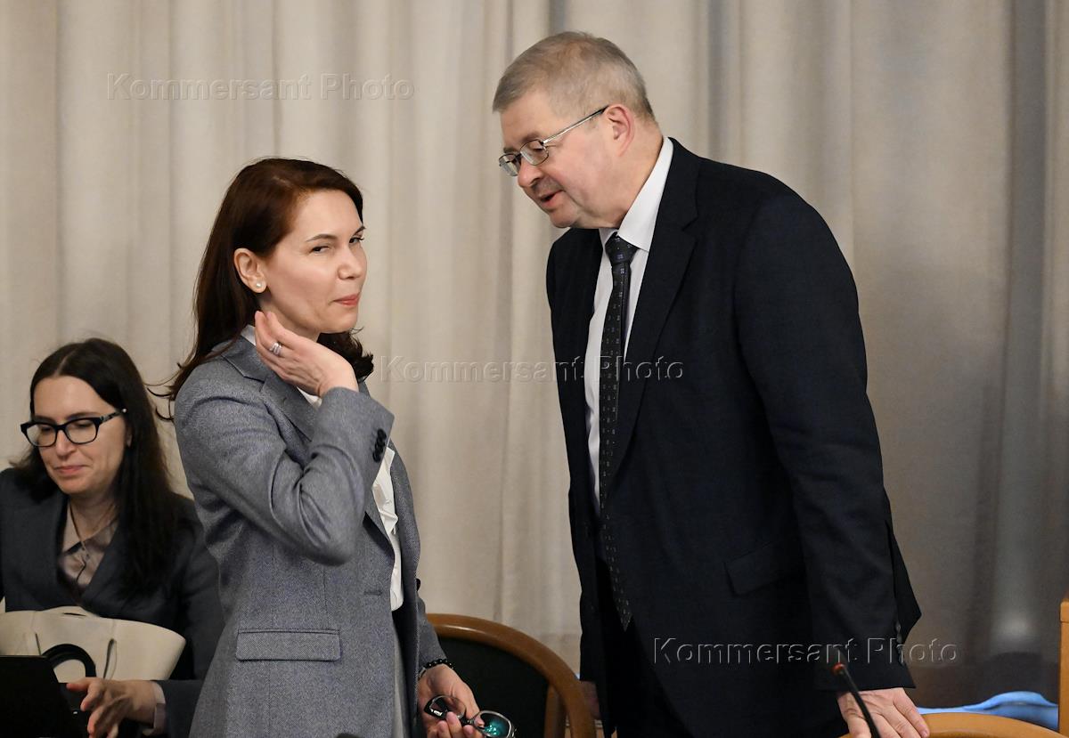 Совместное заседание комитетов Государственной думы (ГД) России по финансовому рынку, бюджету и налогам, экономической политике и контролю по рассмотрению годового отчета Банка России за 2024 год. Первый заместитель председателя Центрального Банка России Дмитрий Тулин (справа) перед началом заседания.