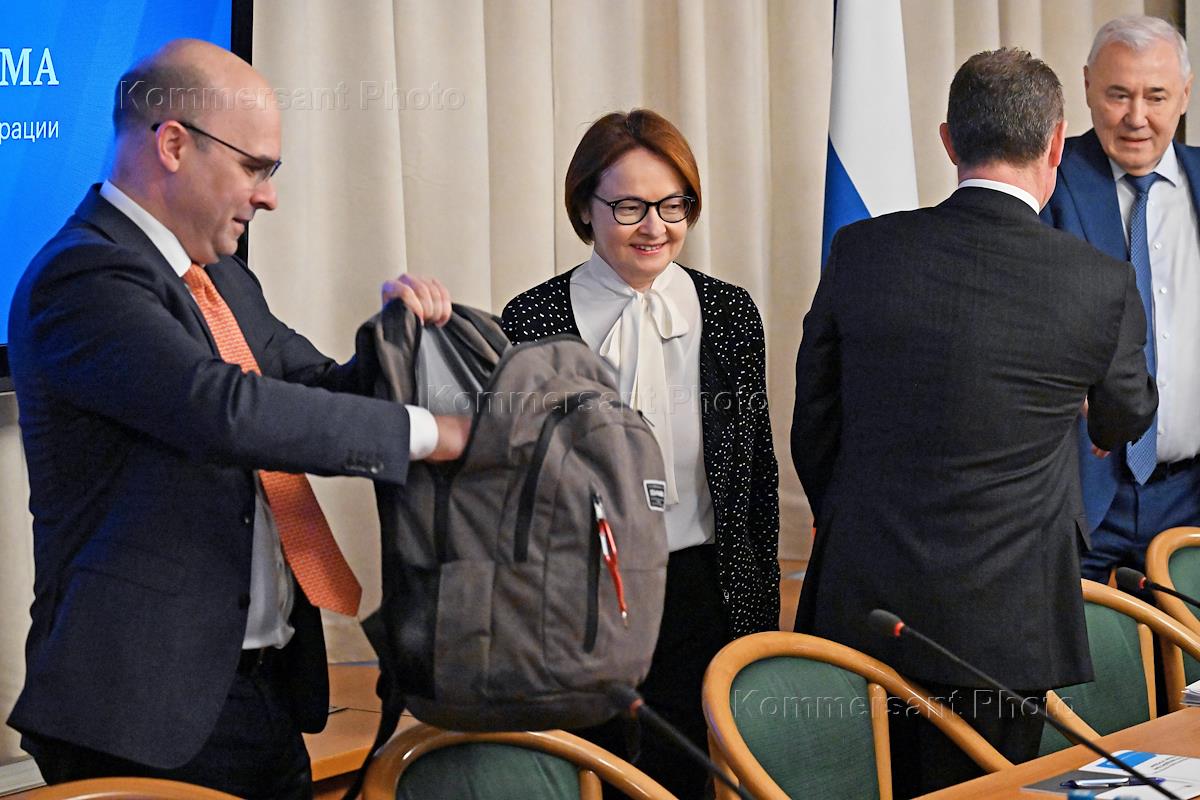 Совместное заседание комитетов Государственной думы (ГД) России по финансовому рынку, бюджету и налогам, экономической политике и контролю по рассмотрению годового отчета Банка России за 2024 год. Председатель Центрального Банка России Эльвира Набиуллина (в центре) и председатель комитета ГД России по финансовому рынку Анатолий Аксаков (второй справа) перед началом заседания.
