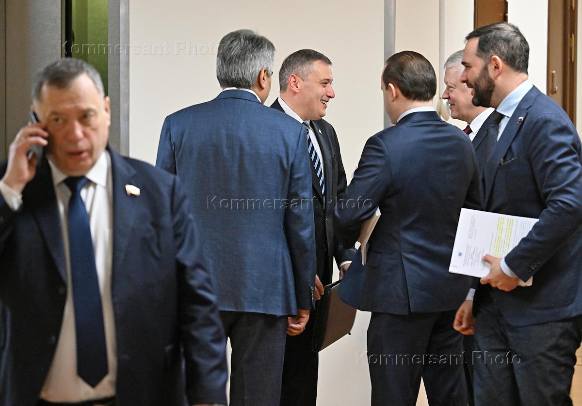 Пленарное заседание Государственной Думы (ГД) России. Слева направо: руководитель фракции партии "Новые люди" в ГД России Алексей Нечаев, заместитель председателя ГД России Владислав Даванков, временно исполняющий обязанности губернатора Курской области Александр Хинштейн, председатель комитета ГД России по безопасности и противодействию коррупции Василий Пискарев и первый заместитель председателя комитета ГД России по науке и высшему образованию Александр Мажуга перед началом заседания.