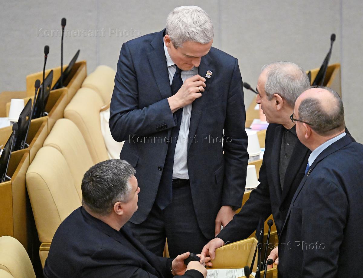 Пленарное заседание Государственной Думы (ГД) России. Слева направо: руководитель фракции партии "Новые люди" в ГД России Алексей Нечаев, заместитель председателя ГД России Владислав Даванков, временно исполняющий обязанности губернатора Курской области Александр Хинштейн, председатель комитета ГД России по безопасности и противодействию коррупции Василий Пискарев и первый заместитель председателя комитета ГД России по науке и высшему образованию Александр Мажуга перед началом заседания.