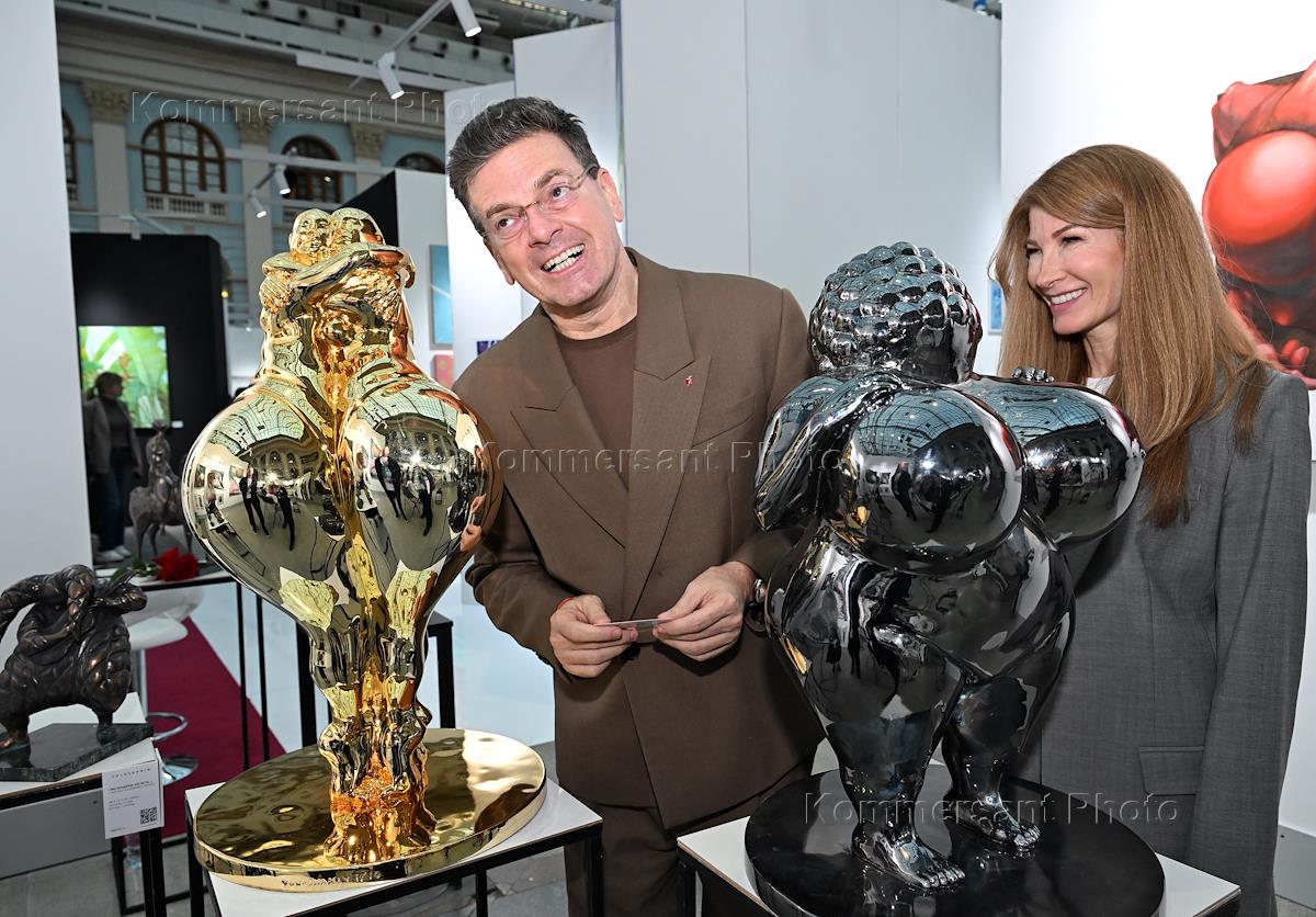Церемония VIP-открытия ярмарки Art Russia от "Синергии" в Гостином дворе. Директор по развитию компании "Боско ди Чильеджи" Константин Андрикопулос (слева) и его супруга Ольга на церемонии.
