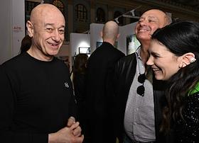 Церемония VIP-открытия ярмарки Art Russia от корпорации "Синергия" в Гостином дворе. Директор по развитию компании "Боско ди Чильеджи" Константин Андрикопулос (слева), его супруга Ольга (вторая слева) и актер, дизайнер Александр Сирадекиан (в центре) на церемонии.