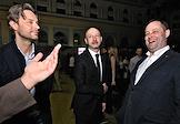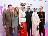 Церемония VIP-открытия ярмарки Art Russia от корпорации "Синергия" в Гостином дворе. Президент корпорации "Синергия" Вадим Лобов (слева) и бизнес-тренер и президент Академии ораторского мастерства Радислав Гандапас (второй слева) и основатель и генеральный директор Агентства Интеллектуальных Событий Анна Видуецкая (третья слева) на церемонии.