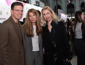 Церемония VIP-открытия ярмарки Art Russia от "Синергии" в Гостином дворе. Слева направо: директор по развитию компании "Боско ди Чильеджи" Константин Андрикопулос, его супруга Ольга и фигуристка Анастасия Гребенкина на церемонии.