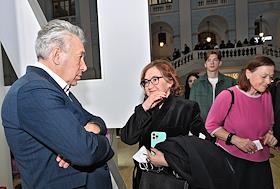 Церемония VIP-открытия ярмарки Art Russia от "Синергии" в Гостином дворе. Генеральный директор, председатель правления АО "Росгеология" Сергей Горьков (слева) и искусствовед Зельфира Трегулова (в центре) во время церемонии.