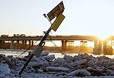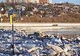 Жанровая фотография. Виды Уфы. Река Белая во время ледохода. Затор из льдин на реке и сломанные столбы освещения.