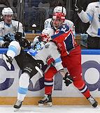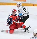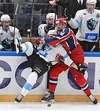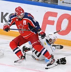 Фонбет - Континентальная хоккейная лига (КХЛ). Чемпионат сезона 2024/25. Плей-офф. 1/8 финала. Матч между командами ЦСКА (Москва) - "Динамо Мн" (Минск) на стадионе "ЦСКА Арена". Игрок команды ЦСКА Максим Соркин (слева) и игрок команды "Динамо Мн" Вадим Щипачёв (справа) во время матча.