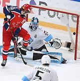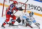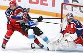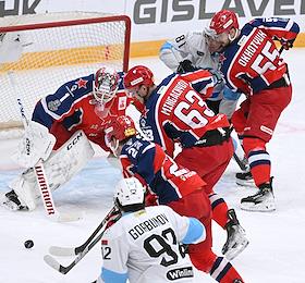 Фонбет - Континентальная хоккейная лига (КХЛ). Чемпионат сезона 2024/25. Плей-офф. 1/8 финала. Матч между командами ЦСКА (Москва) - "Динамо Мн" (Минск) на стадионе "ЦСКА Арена". Вратарь команды ЦСКА Иван Просветов (слева) во время матча.