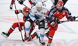 Фонбет - Континентальная хоккейная лига (КХЛ). Чемпионат сезона 2024/25. Плей-офф. 1/8 финала. Матч между командами ЦСКА (Москва) - "Динамо Мн" (Минск) на стадионе "ЦСКА Арена". Слева направо: игрок команды ЦСКА Руслан Исхаков, игрок команды "Динамо Мн" Вадим Шипачёв и игрок команды ЦСКА Егор Афанасьев во время матча.