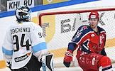 Фонбет - Континентальная хоккейная лига (КХЛ). Чемпионат сезона 2024/25. Плей-офф. 1/8 финала. Матч между командами ЦСКА (Москва) - "Динамо Мн" (Минск) на стадионе "ЦСКА Арена". Вратарь команды "Динамо Мн" Василий Демченко (слева) и игрок команды ЦСКА Павел Карнаухов (справа) во время матча.