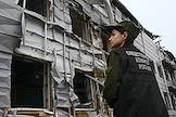 Ситуация в Курской области. Последствия ракетной атаки ВСУ на Рыльск. Сотрудница Следственного комитета России у разрушенного здания.