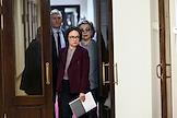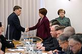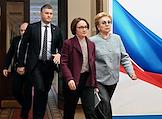 Заседание президиума фракции "Единая Россия" с участием председателя Центрального Банка России Эльвиры Набиуллиной в Государственной думе (ГД) России. Слева направо: первый заместитель председателя комитета ГД России по международным делам Светлана Журова, заместители председателя Центрального Банка России Алексей Заботкин и Филипп Габуния после окончания заседания.