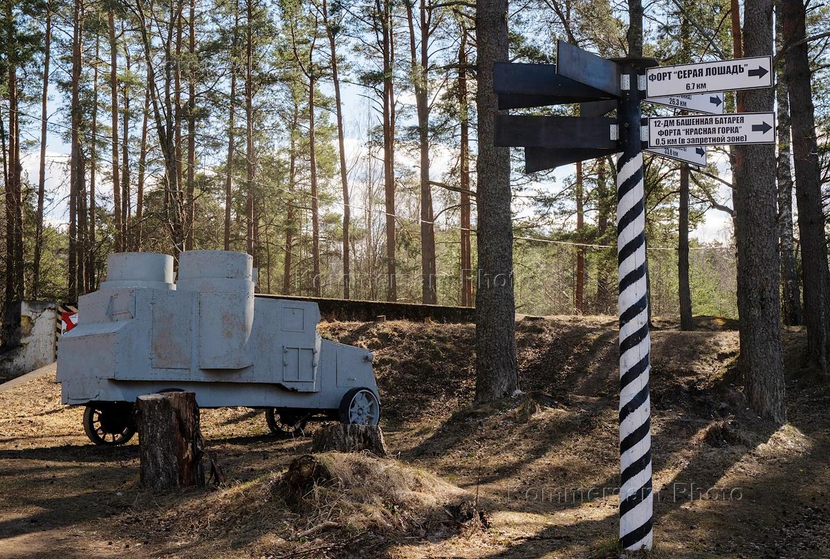 Виды форта "Красная горка" в Лебяженском городском поселении. Макет броневика на территории форта.