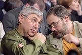 Политолог, глава Фонда эффективной политики Глеб Павловский (слева) и галерист Марат Гельман (справа) во время проведения первого публичного мероприятия Медиасоюза "Наше время. Медиа-форум 2001". Встреча состоялась в отеле "Прибалтийская".
