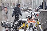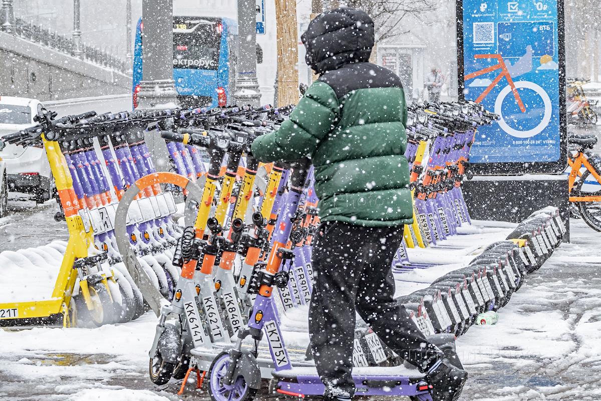 Снегопад в Москве. Жанровая фотография. Молодой человек у парковки электросамокатов во время снегопада.