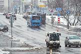 Снегопад в Москве. Жанровая фотография. Автомобили во время движения по расчищенной от снега дороге.
