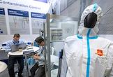 Выставка и форум по фармацевтике и биотехнологиям "IPhEB 2025" в конгрессно-выставочном центре "Экспофорум". Жанровая фотография. Манекен в защитном костюме и маске.