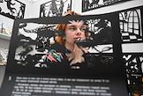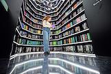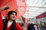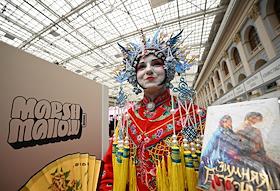 Международная ярмарка интеллектуальной литературы "non/fictioN Весна" в Гостином дворе. Жанровая фотография. Девушка в национальном азиатском костюме на ярмарке.