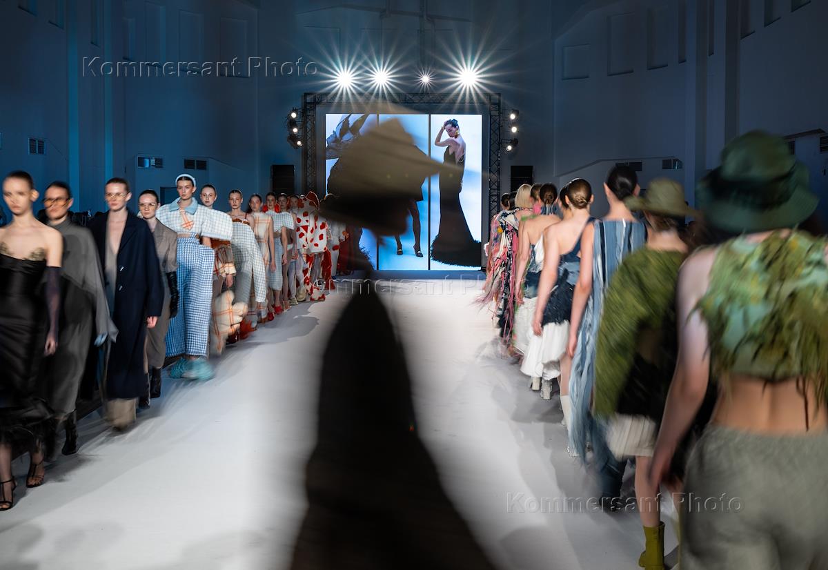 Показ финалистов конкурса "Новые имена в моде" в Доме Ленинградской Торговли (ДЛТ). Финальный выход всех участников показа.