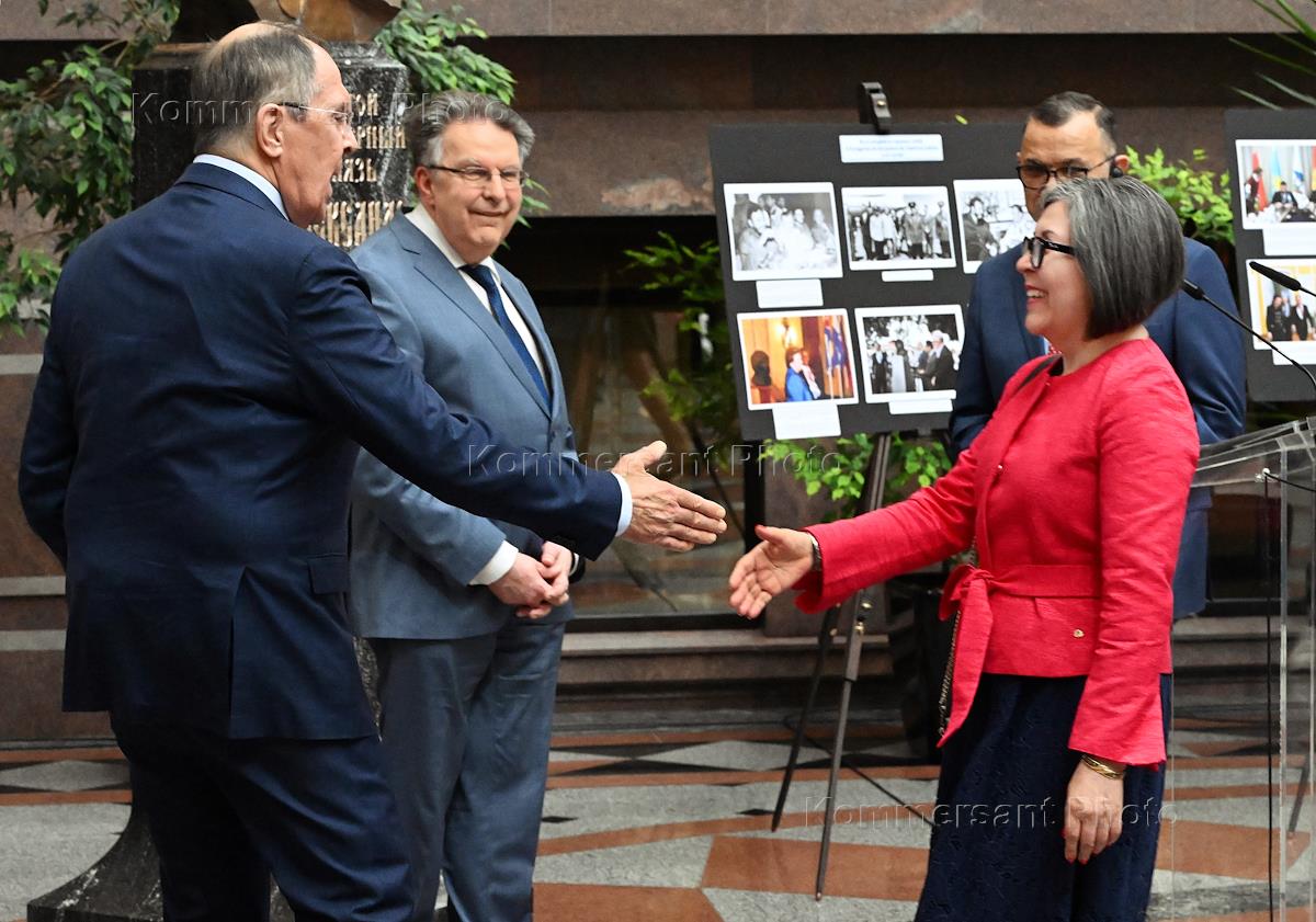 Церемония открытия комплексной выставки "Юбилейный год: от Мексики до Аргентины" в Министерстве иностранных дел России. Министр иностранных дел России Сергей Лавров (в центре) на церемонии.