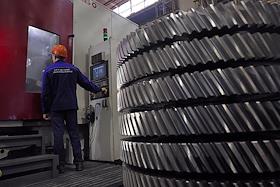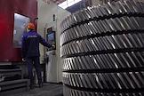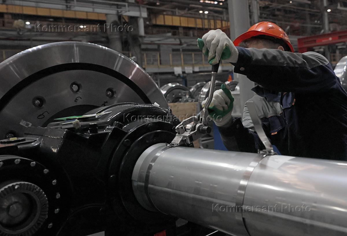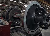 Визит временно исполняющего обязанности губернатора Свердловской области Дениса Паслера на завод "Уральские локомотивы" (группа "Синара"). Жанровая фотография. Колеса локомотива.