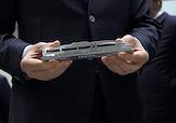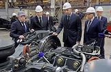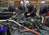 Визит временно исполняющего обязанности губернатора Свердловской области Дениса Паслера на завод "Уральские локомотивы" (группа "Синара"). Жанровая фотография. Модель локомотива.