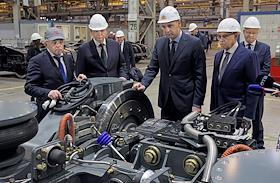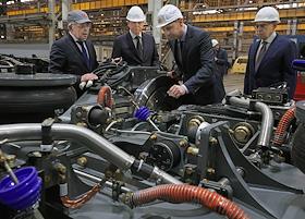 Визит временно исполняющего обязанности губернатора Свердловской области Дениса Паслера на завод "Уральские локомотивы" (группа "Синара"). Временно исполняющий обязанности губернатора Свердловской области Денис Паслер (второй справа) и генеральный директор, член правления ООО "Уральские локомотив" Олег Спаи (слева) во время посещения завода.