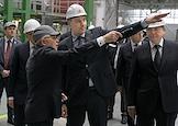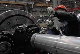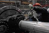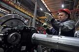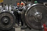 Визит временно исполняющего обязанности губернатора Свердловской области Дениса Паслера на завод "Уральские локомотивы" (группа "Синара"). Жанровая фотография. Рабочие в производственном цехе.
