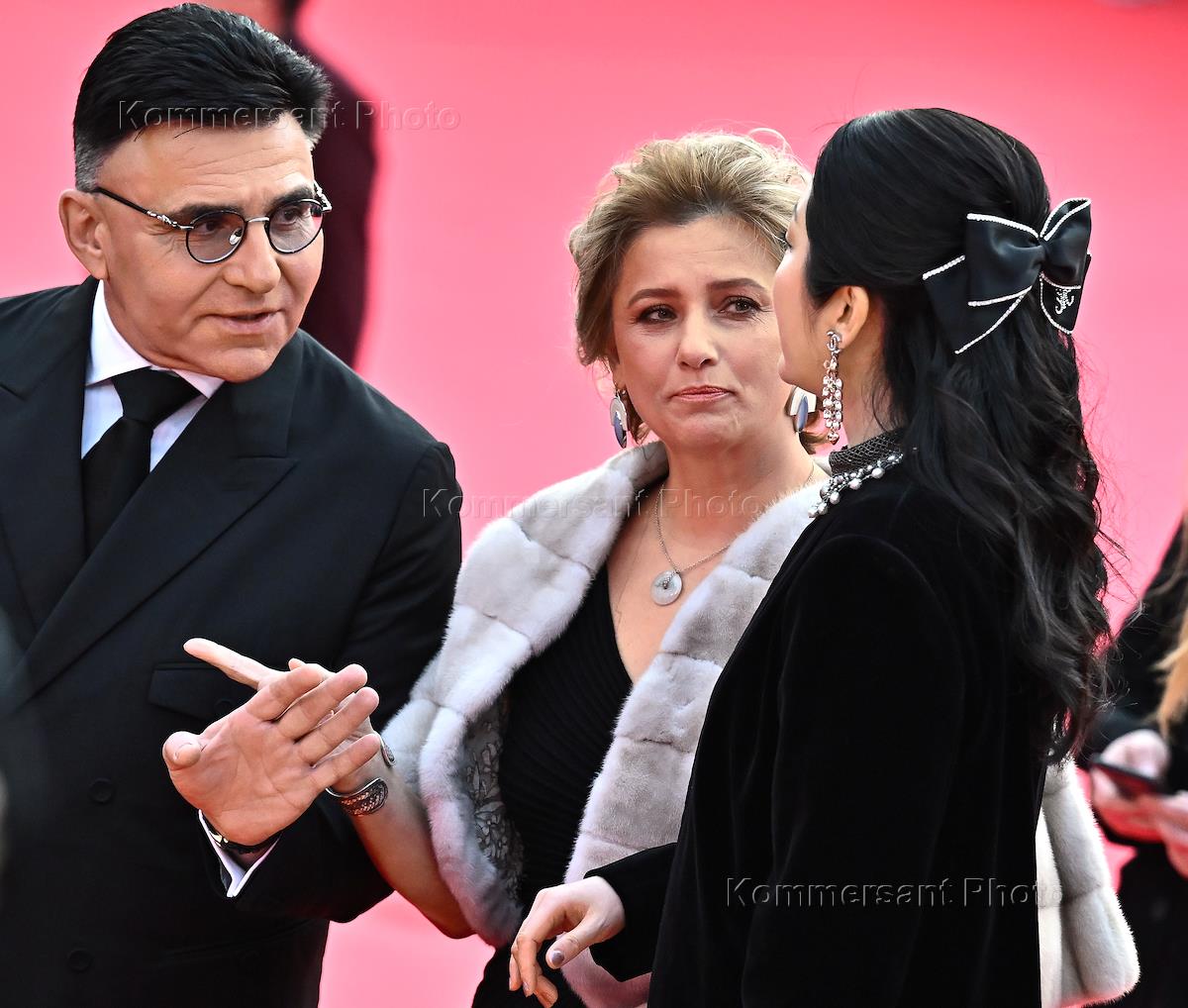 47-й Московский Международный Кинофестиваль (ММКФ). Церемония открытия в Московском театре мюзикла. Председатель СТД России, художественный руководитель Московского театра Олега Табакова, директор театра "Современник", актер, режиссер Владимира Машкова (в центре) во время церемонии.