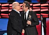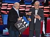47-й Московский Международный Кинофестиваль (ММКФ). Церемония открытия в Московском театре мюзикла. Председатель Союза кинематографистов России, кинорежиссер Никита Михалков (слева) и председатель жюри основного конкурса ММКФ, испанский режиссер, продюсер Луис Миньярро (справа) на церемонии.