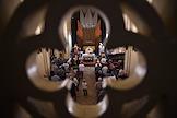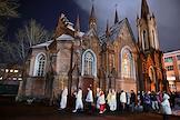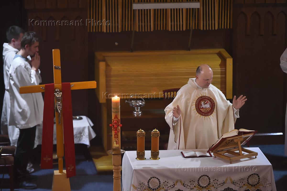 Празднование католической пасхи. Прихожане и священнослужители прихода Римско-католической церкви на пасхальной службе Навечерия Пасхи в Святую Субботу в Храме Преображения Господня.