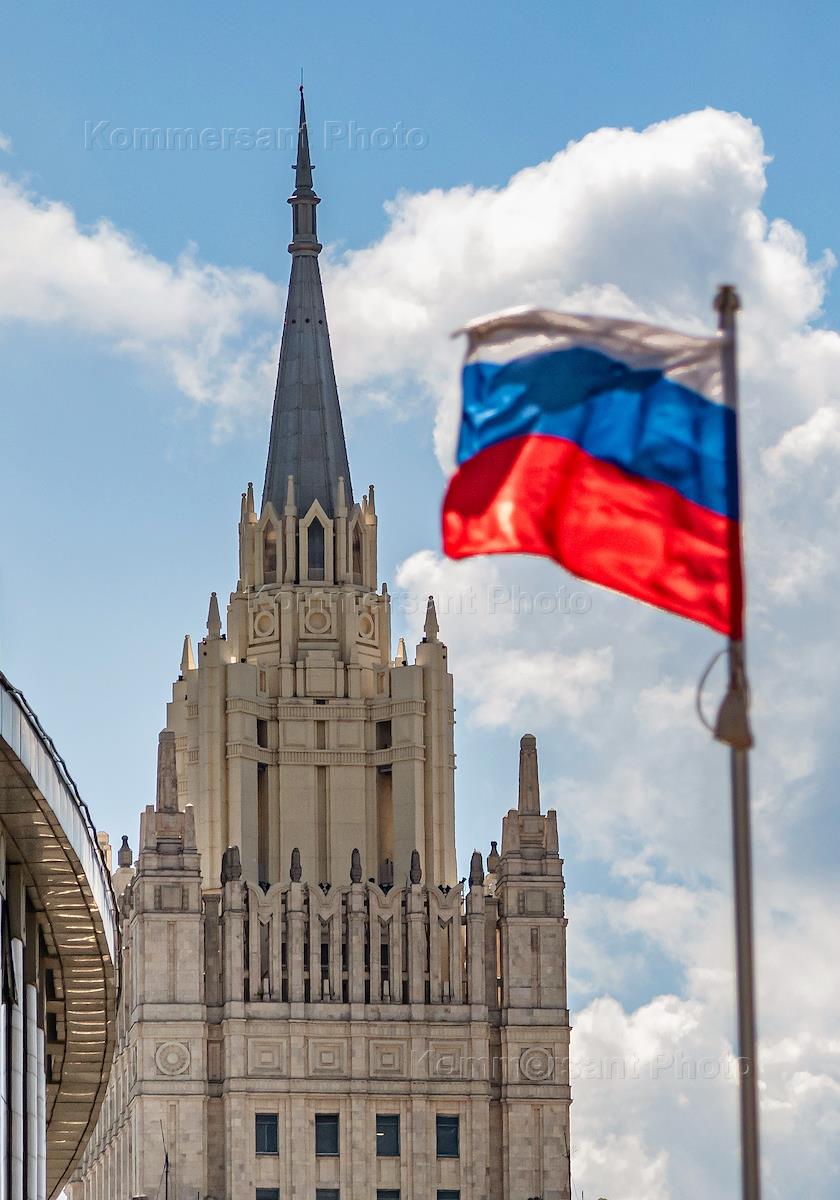 Виды Москвы. Жанровая фотография. Флаг России возле здания Министерства иностранных дел России.