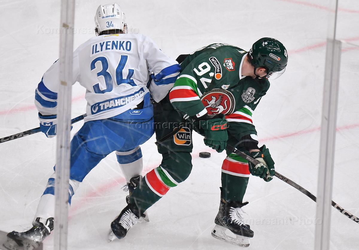 Фонбет - Континентальная хоккейная лига (КХЛ). Чемпионат сезона 2024/25. 1/4 финала. Матч между командами "Ак Барс" (Казань) - "Динамо" (Москва) на стадионе "Татнефть Арена". Игрок команды "Динамо" Артем Ильенко (слева) и игрок команды "Ак Барс" Дмитрий Кателевский (справа) во время матча.